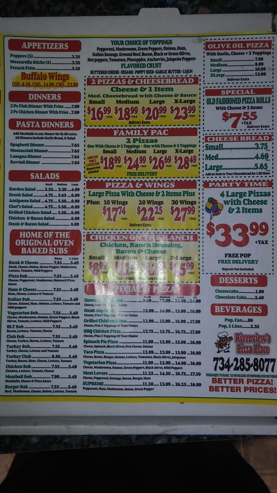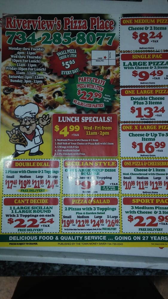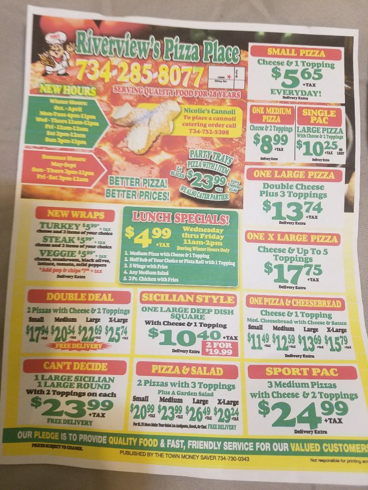 Welcome to Riverview’s Pizza Place, an exceptional pizzeria located in Riverview, MI. This family-owned gem prioritizes quality, serving up pizzas that are lovingly crafted with tangy sauce and a variety of toppings, all atop a perfectly baked crust. Renowned for its humble atmosphere and friendly staff, the restaurant provides a cozy experience whether you're dining in, taking out, or ordering for delivery.